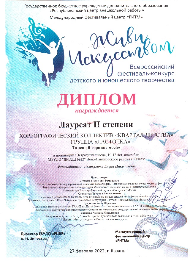 - Хореографический коллектив "Квартал детства" группу "Ласточка" - Лауреата 2 степени (преподаваатель Авакумова Е.Н.)