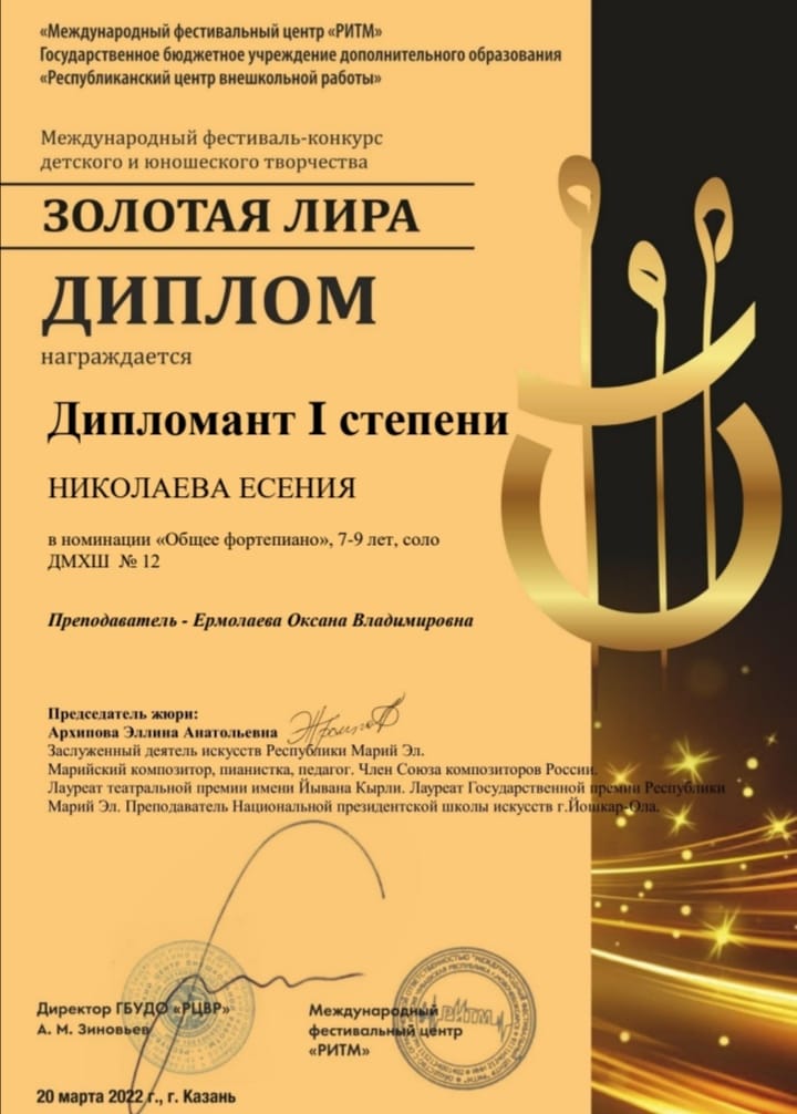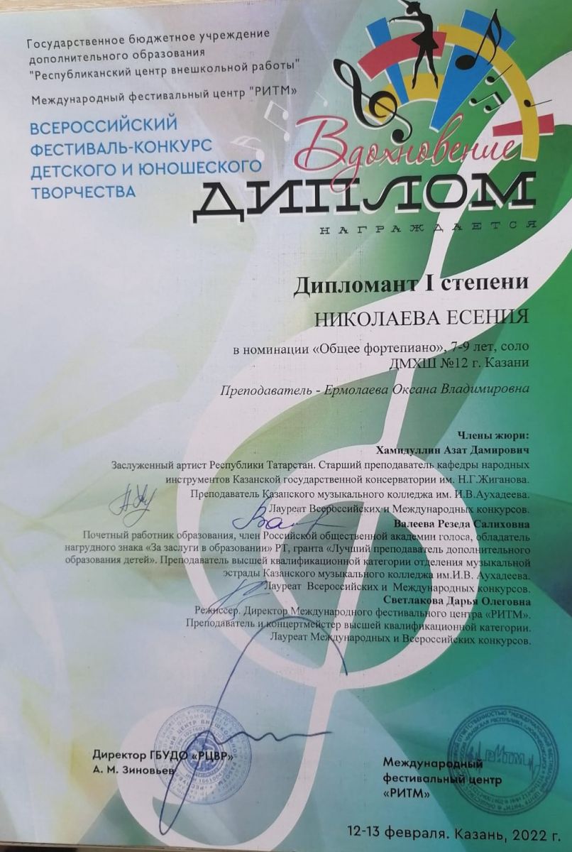 - Николаеву Есению - Дипломанта 1 степени в номинации "Общее фортепиано" (преподаватель Ермолаева О.В.)