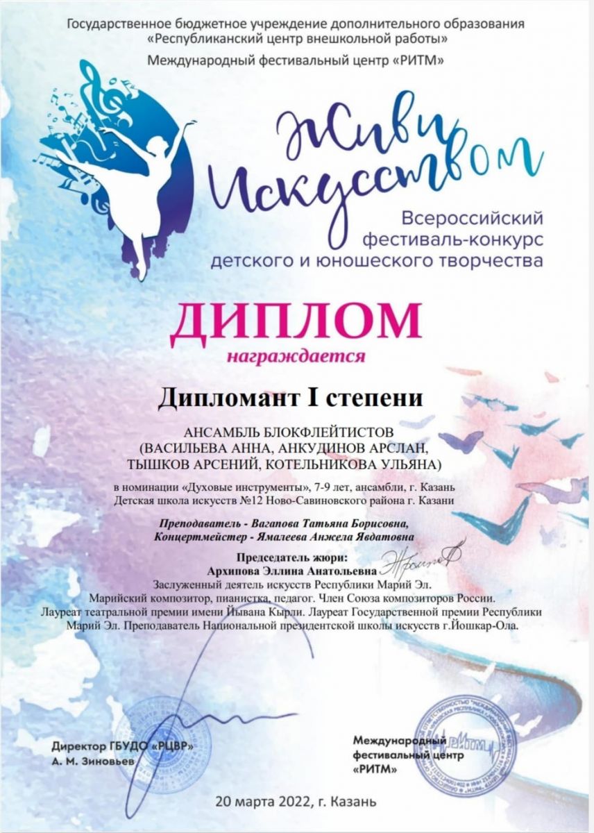 - Ансамбль блокфлейтистов - Дипломантов 1 степени (преподаватель Вагапова Т.Б., концертмейстер Ямалеева А.Я.)