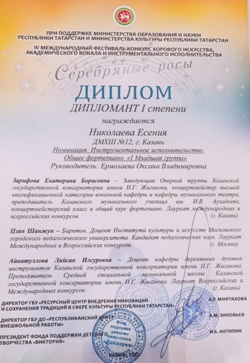 Поздравляем с успешным выступлением на IV Международном фестиваль-конкурсе хорового искусства, академического вокала и инструментального исполнительства "Серебряные росы":- Николаеву Есению - Дипломанта 1 степени (преподаватель Ермолаева О.В.)