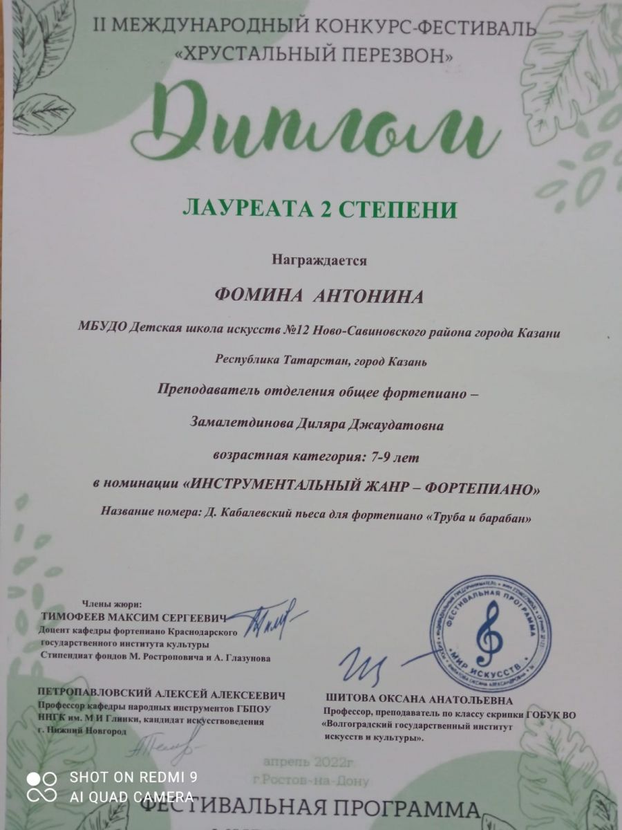 Поздравляем с успешным выступлением на II Международном конкурсе-фестивале "Хрустальный перезвон":- Фомину Антонину - Лауреата 2 степени (преподаватель Замалетдинова Д,Д,)