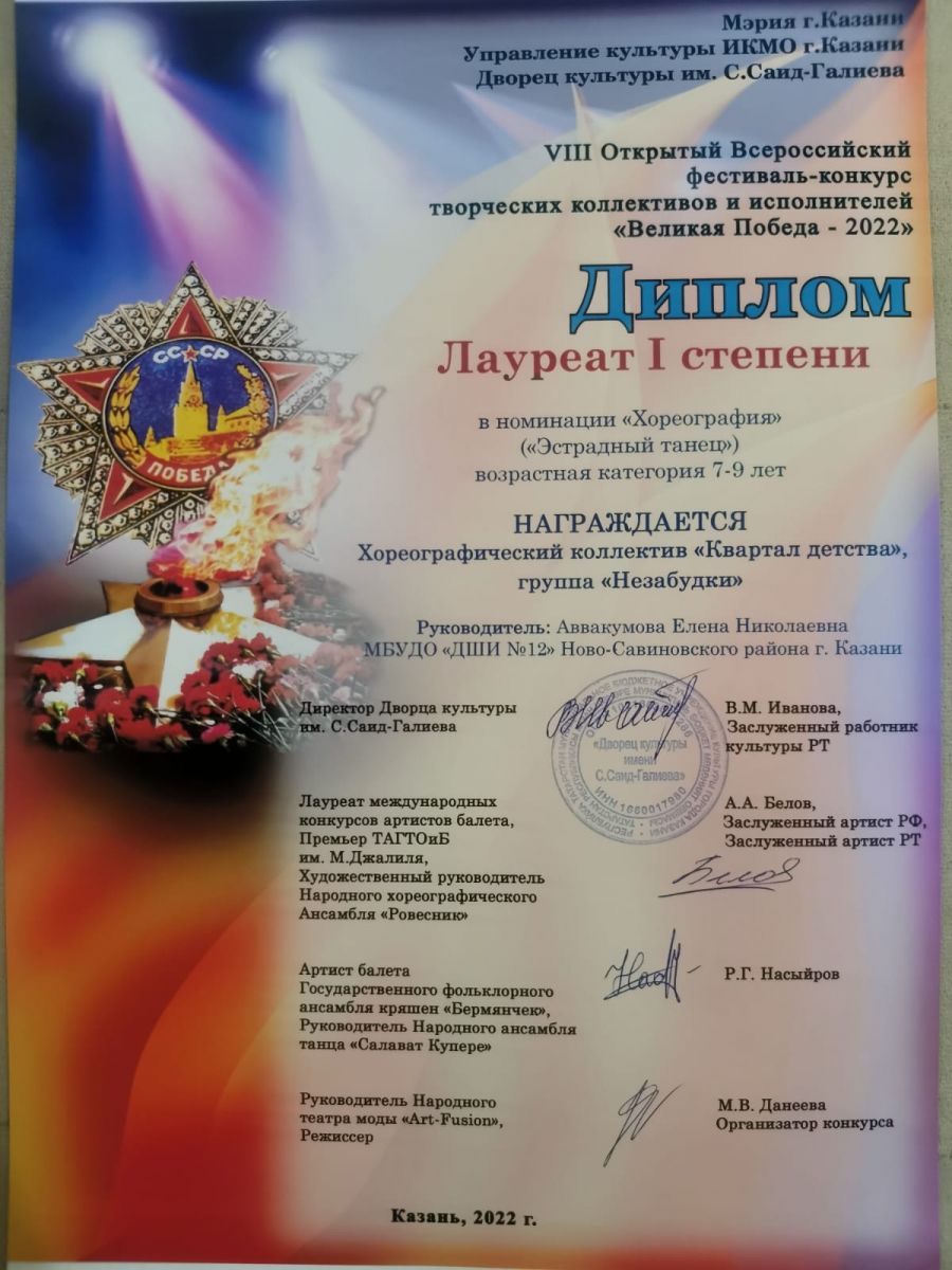 Поздравляем с успешным выступлением на VIII Открытом Всероссийском фестиваль-конкурсе творческих коллективов и исполнителей "Великая Победа - 2022":- Хореографический коллектив "Квартал детства" группу "Незабудки" - Лауреатов 1 степени (преподаватель Аввакумова Е.Н.)