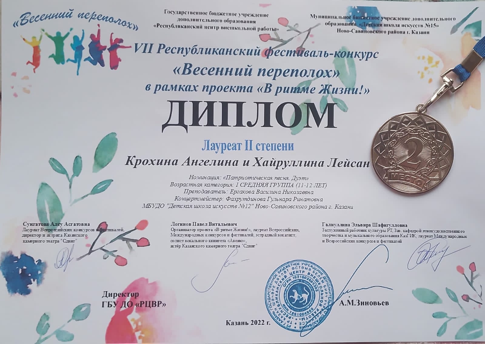 Поздравляем с успешным выступлением на IIV Республиканском фестиваль-конкурсе "Весенний переполох" в рамках проекта "В ритме Жизни!":- Крохину Ангелину и Хайруллину Лейсан - Лауреатов 2 степени (преподаватель Ергакова В.Н.) в номинации "Патриотитческая песня.Дуэт".