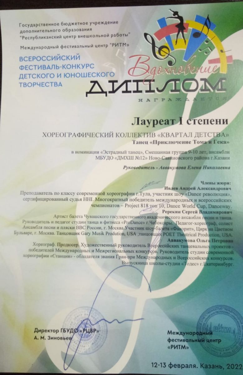 Поздравляем с успешным выступлением на Всероссийском фестиваль-конкурсе детского и юношеского творчества "Вдохновение":- Хореографический коллектив "Квартал детства" - Лауреатов 1 степени в номинации "Эстрадный танец" (преподаватель Аввакумова Е.Н.)