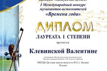 - Клевинскую Валентину - Лауреата 1 степени в номинации Инструментальное исполнительство. Преподаватель Замалетдинова Д.Д.