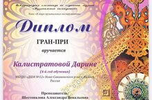 Поздравляем с успешным выступлением на Международной олимпиаде по слушанию музыки "Музыкальный калейдоскоп" с дипломом ГРАН-ПРИ Калистратову Дарину. Преподаватель Шестопалова Александра Венальевна. Желаем дальнейших успехов!