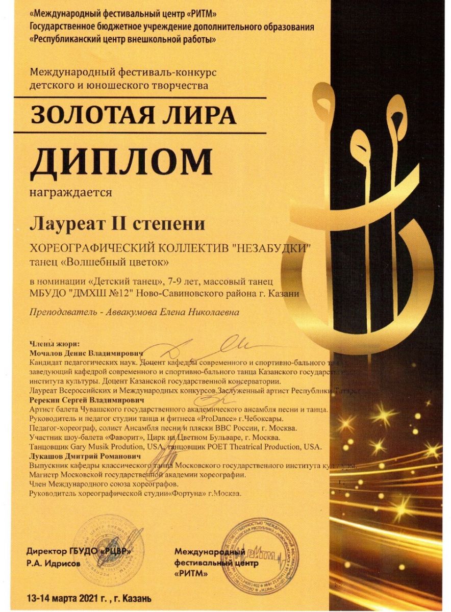Поздравляем с успешным выступлением на Международном фестиваль-конкурсе детского и юношеского творчества "Золотая лира":- Хореографический коллектив "Незабудки" - Лауретов 2 степени в номинации "Детский танец" (преподаватель Аввакумова Е.Н.)