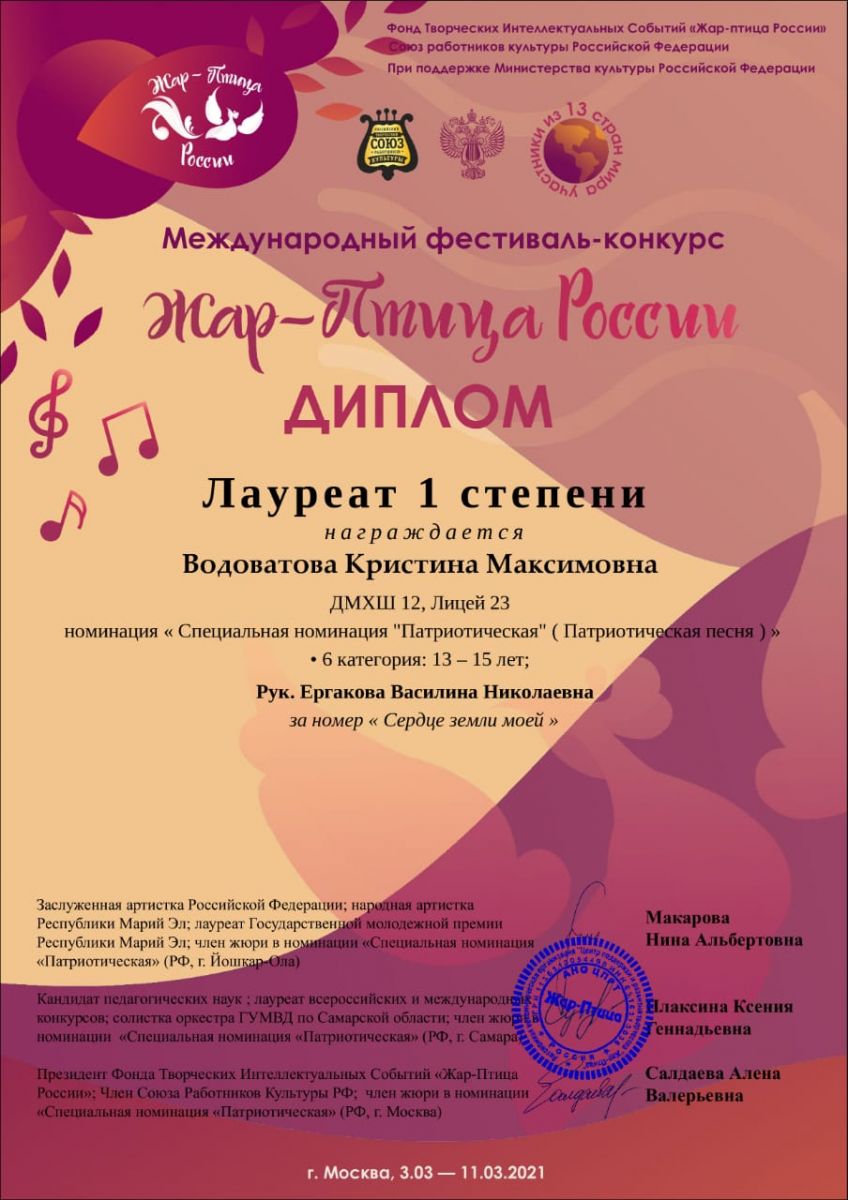 Поздравляем с успешным выступлением на Международном фестиваль-конкурсе "Жар - Птица России":- Водоватову Кристину - Лауреата 1 степени в номинации "Специальная номинация "Патриотическая" (Патриотиче6ская песня)" (преподаватель Ергакова В.Н.)