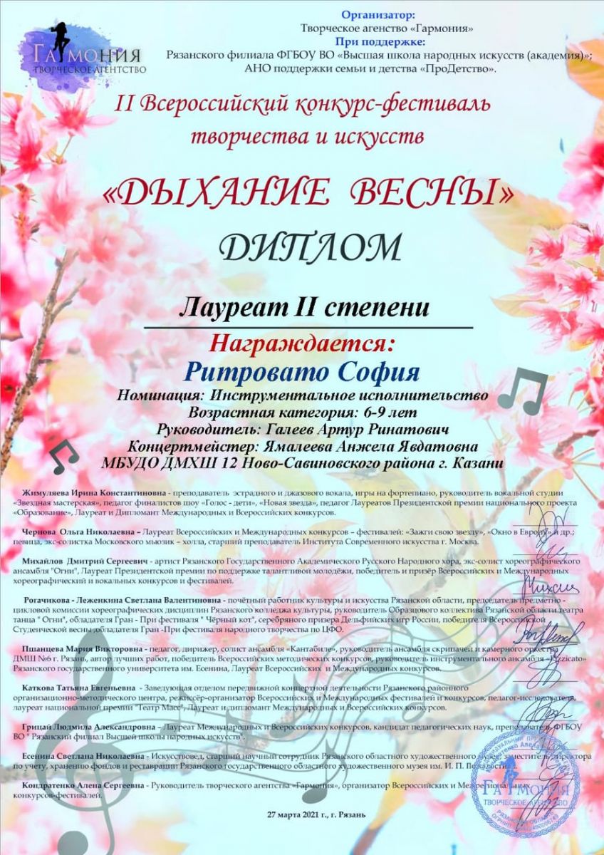 Поздравляем с успешным выступлением на 2 Всероссийском конкурс-фестивале творчества и искусств "Дыхание весны":- Ритровато Софию - Лауреата 2 степени ( преподаватель Галеев А.Р., концертмейстер Ямалеева А.Я.) в номинации Инструментальное исполнительство, 6-9 лет