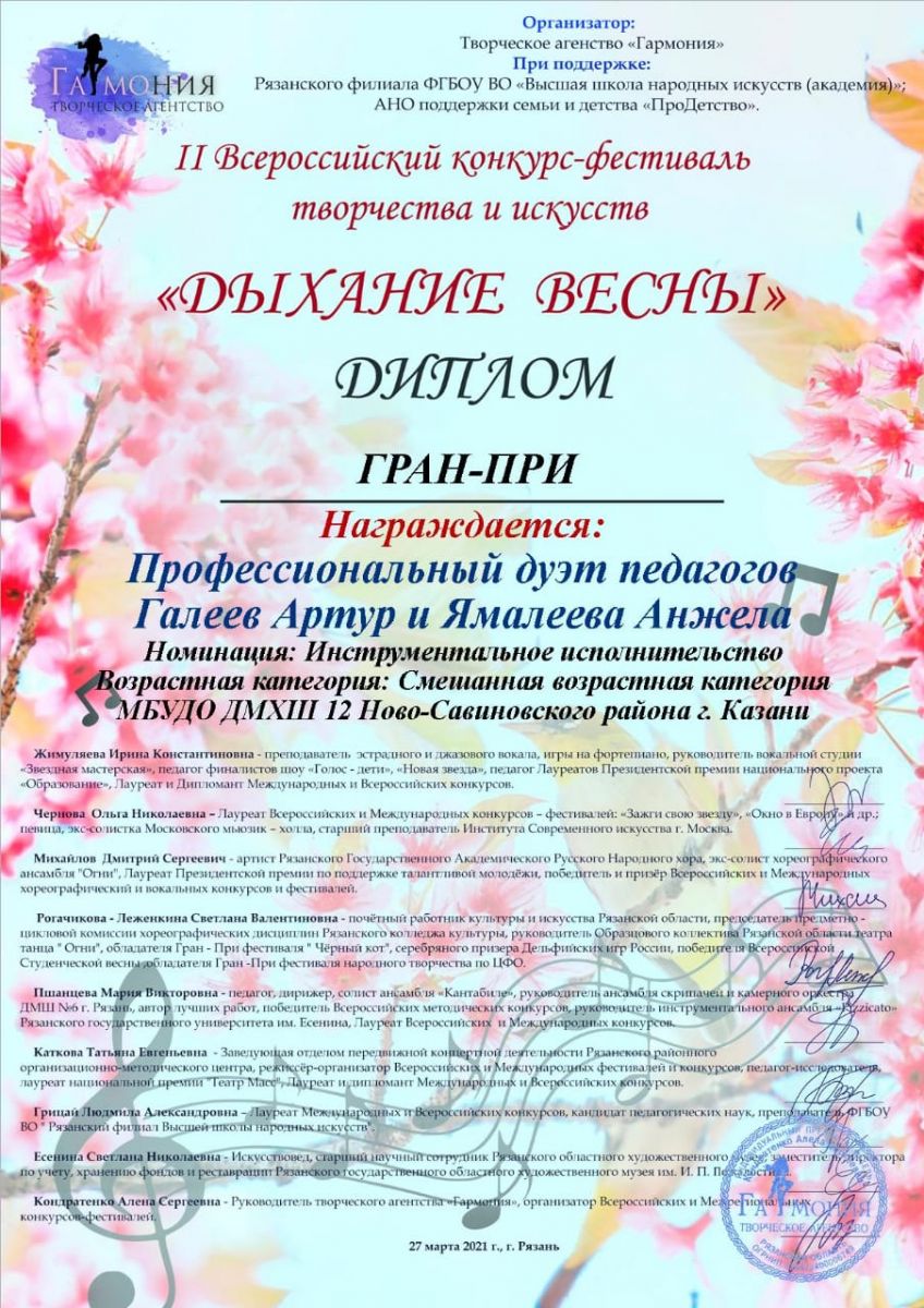 - Профессиональный дуэт педагогов : Галеева Артура Ринатовича и Ямалееву Анжелу Явдатовну - Лауреатов 1 степени, Дипломантов ГРАН - ПРИ