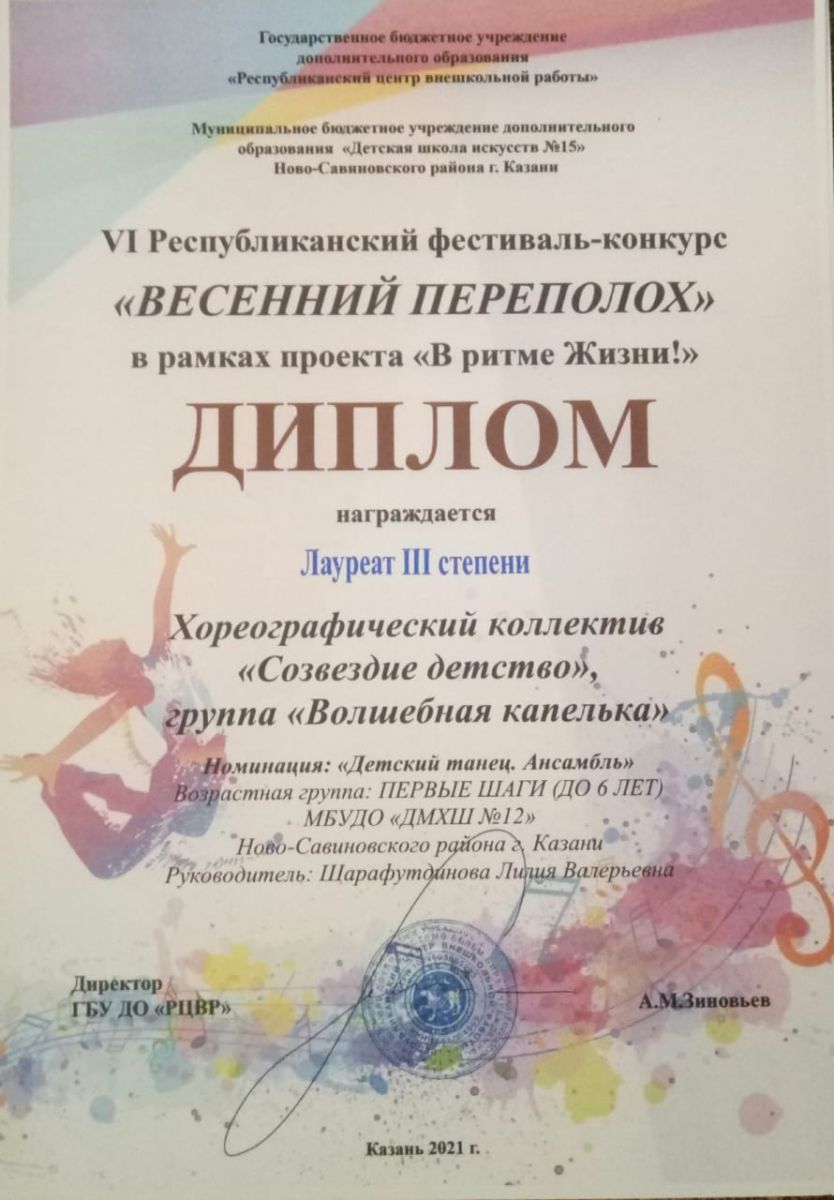 - Хореографический коллектив "Созвездие детство", группа "Волшебная капелька" - Лауреатов 3 степени (преподаватель Шарафутдинова Л.В.), номинация:"детский танец. Ансамбль", возростная группа: Первые шаги (до 6 лет)