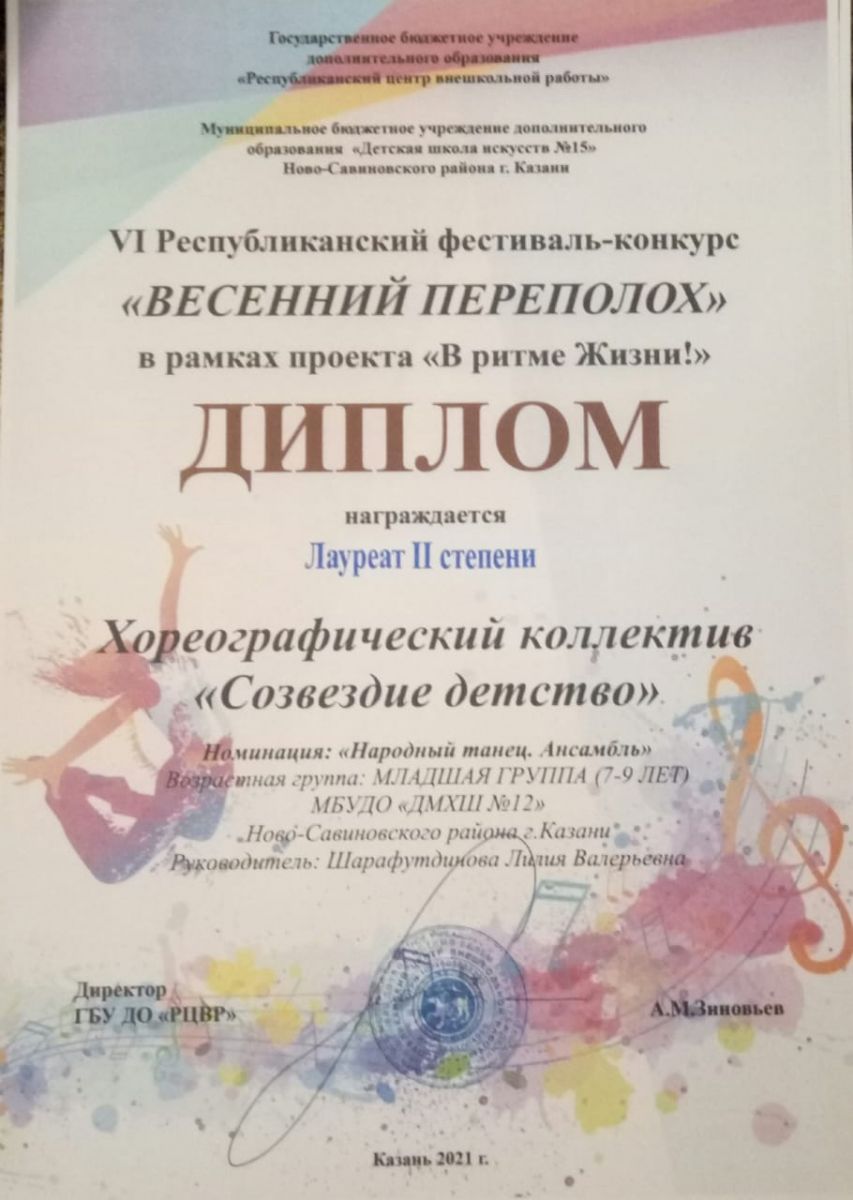 - Хореографический коллектив "Созвездие детство" - Лауреатов 2 степени (преподаватели Шарафутдинова Л.В., Асхатова Д.И.), номинация: "Эстрадный танец, Ансамбль", 2 средняя группа (13-15 лет)