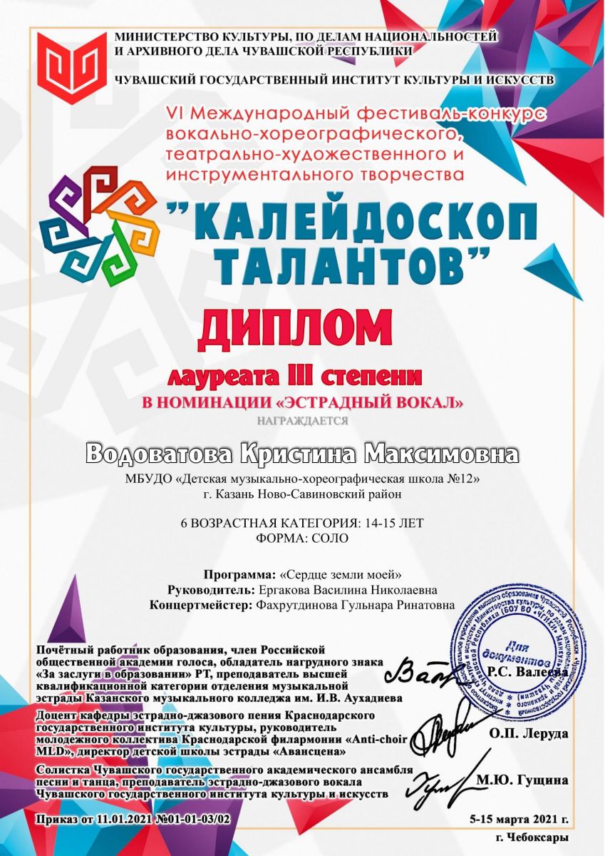 - Водоватову Кристину - Лауреата 3 степени (преподаватель Ергакова В.Н.)