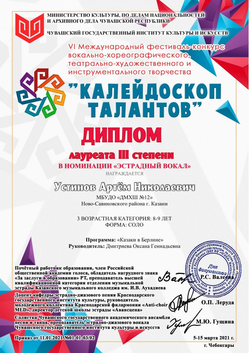 - Устинова Артема - Лауреата 3 степени (преподаватель Дмитриева О.Г.)