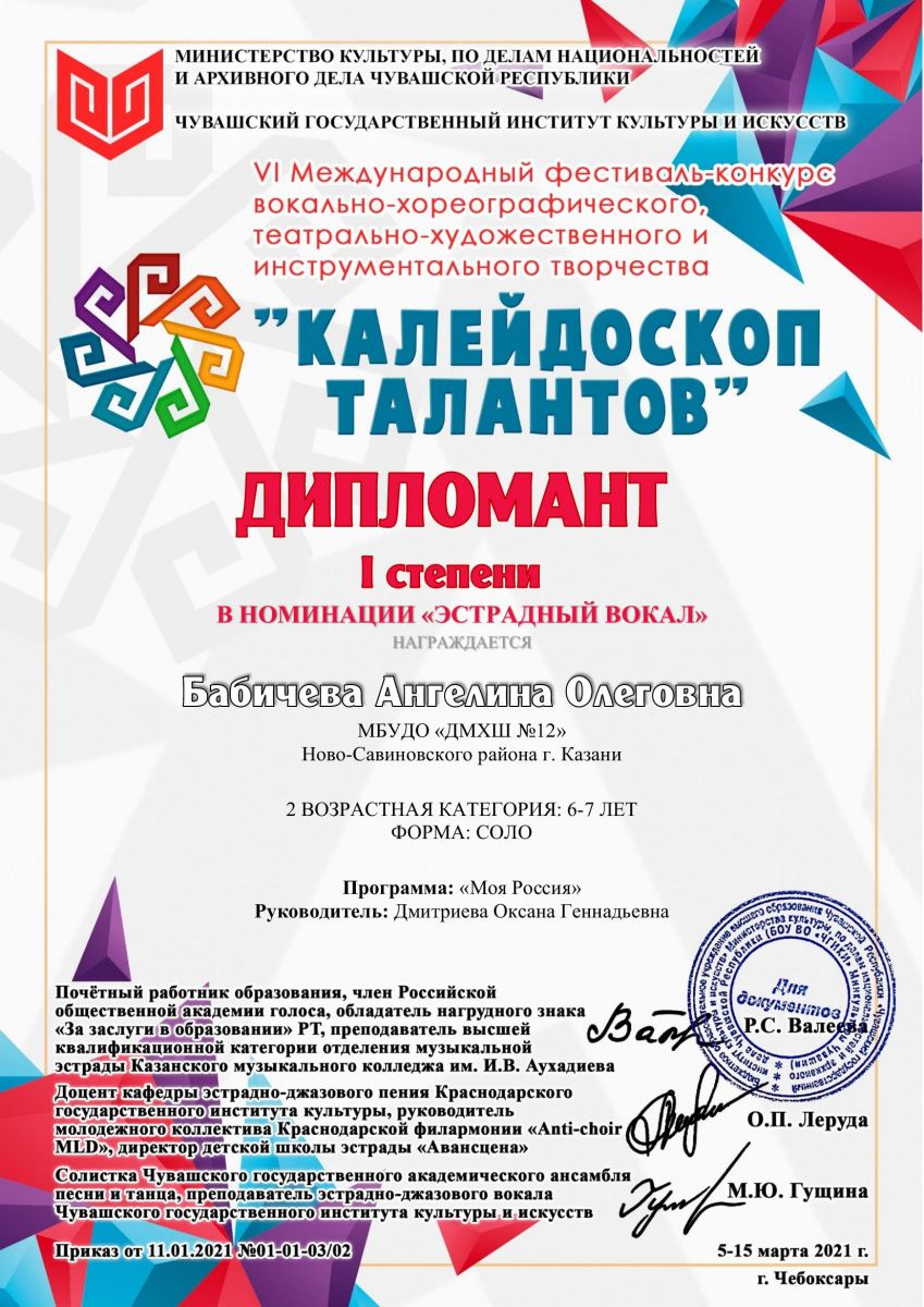- Бабичеву Ангелину - Дипломанта 1 степени (преподаватель Дмитриева О.Г.)