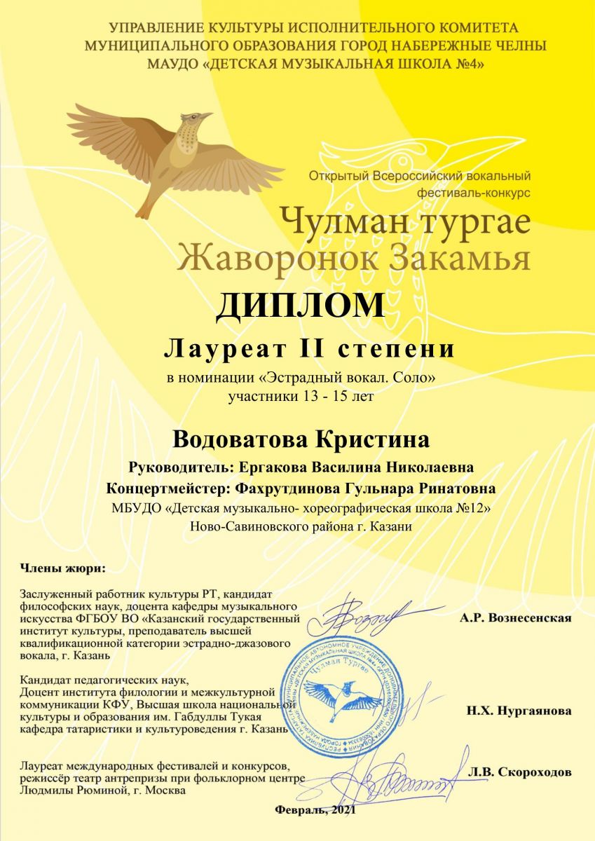 Поздравляем с успешным выступлением на Открытом Всероссийском вокальном фестиваль-конкурсе "Чулман тургае (Жаворонок Закамья)"- Водоватову Кристину - Лауреата 2 степени (преподаватель Ергакова В.Н.)