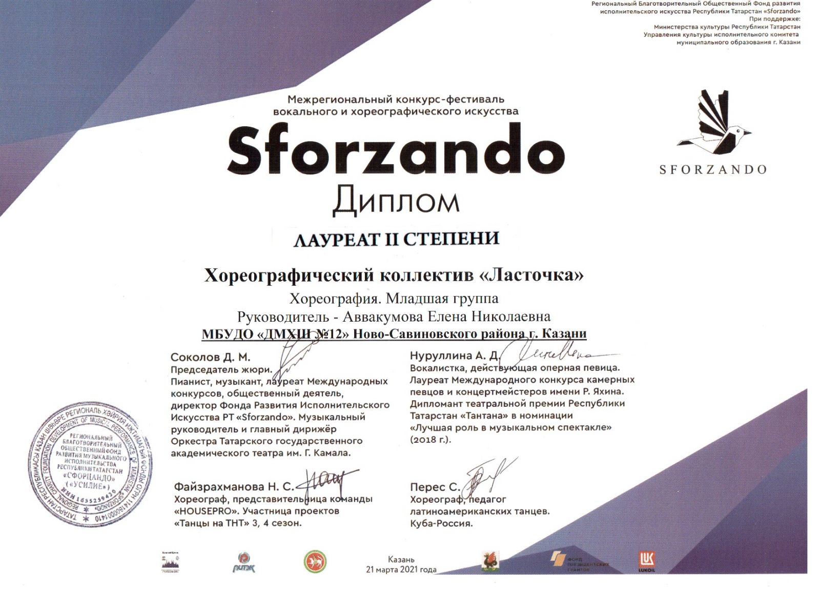 Поздравляем с успешным выступлением на Межрегиональном конкурс-фестивале вокального и хореографического искусства "Sfortzando":- Хореографический коллектив "Ласточка" - Лауреатов 2 степени (преподаватель Аввакумова Е.Н.)