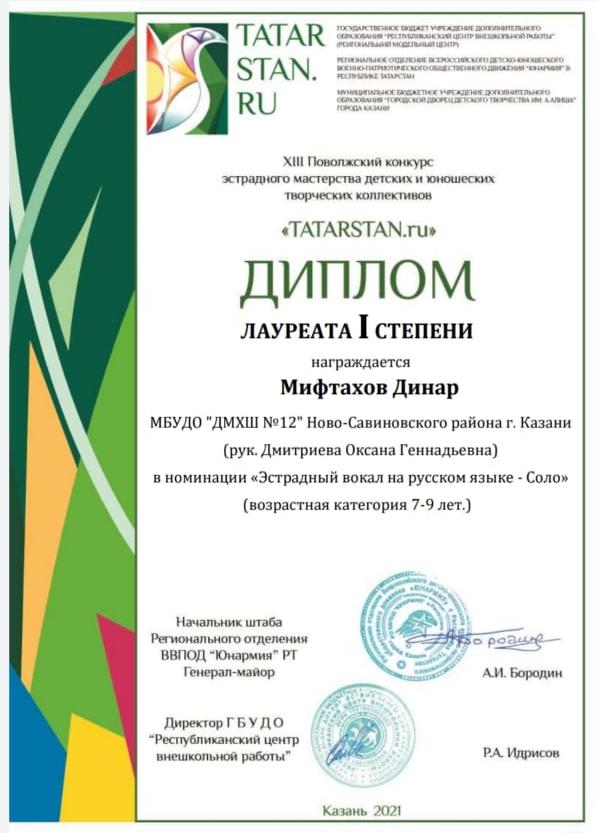 Поздравляем с успешным выступлением на XIII Поволжском конкурсе эстрадного мастерства детских и юношеских творческих коллективов "TATARSTAN.ru":- Мифтахова Динара -Лауреата 1 степени (преподаватель Дмитриева О.Г.) в номинации "Эстрадный вокал на русском языке - Соло", 7-9 лет