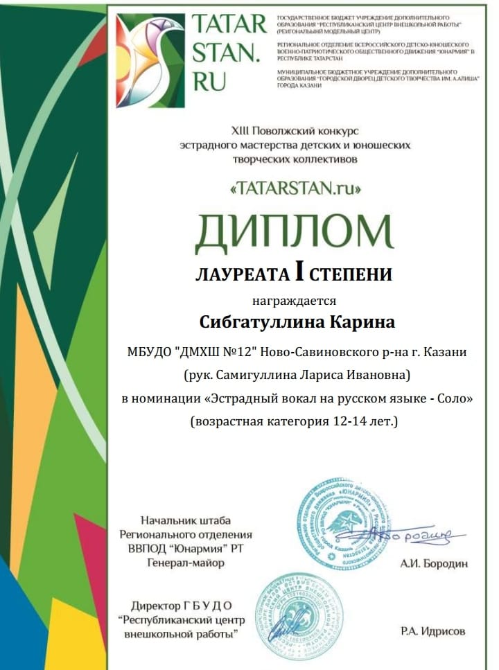 - Сибгатуллину Карину - Лауреата 1 степени (преподаватель Самигуллина Л.И.) в номинации "Эстрадный вокал на русском языке- Соло", 12-14 лет-