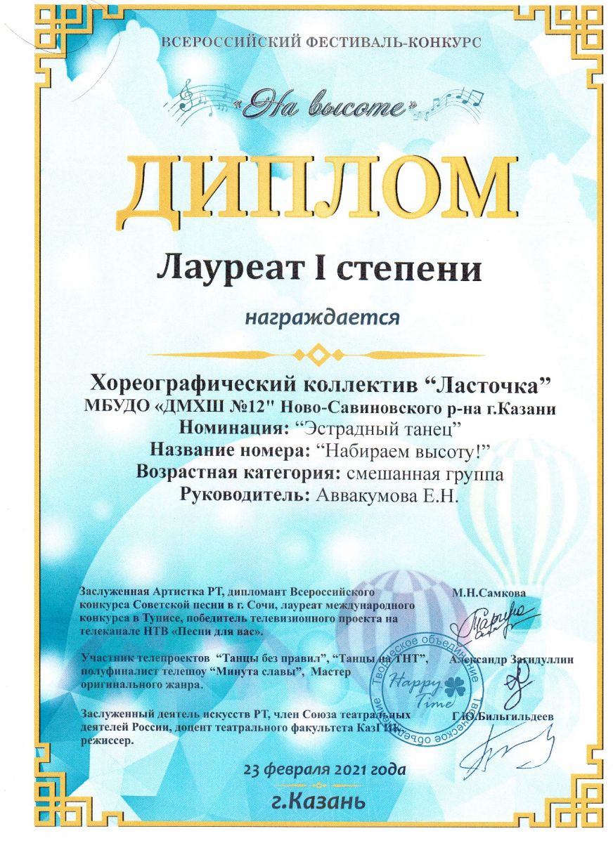 Поздравляем с успешным выступлением на Всероссийском фестиваль-конкурс "На высоте"- Хореографический коллектив "Ласточка" - Лауреатов 1 степени ( преподаватель Аввакумова Е.Н.)