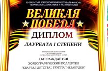Поздравляем с успешным выступлением на XI ОТКРЫТОМ ВСЕРОССИЙСКОМ ФЕСТИВАЛЕ-КОНКУРСЕ ТВОРЧЕСКИХ КОЛЛЕКТИВОВ И ИСПОЛНИТЕЛЕЙ «ВЕЛИКА ПОБЕДА»:
