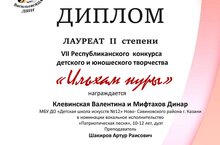 - Дуэт: Клевинская Валентина и Мифтахов Динар - Лауреаты 2 степени в номинации вокальное исполнительство, 10-12 лет. Преподаватель Шакиров А.Р.