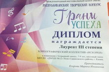 Поздравляем с успешным выступлением на Республиканском творческом конкурсе "Грани успеха" хореографический коллектив "Искорки" - Лауреатов 3 степени (преподаватель Егорова М.И.), Ансамбль гитаристов - Дипломантов 1 степени (преподаватель Конакова Н.А.).