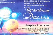 -Хореографический коллектив «Квартал детства», группу «Незабудки»- Лауреат I степени. Руководитель Аввакумова Е.Н.