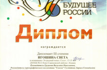 Поздравляем Игошину Светлану - дипломанта 3 степени Всероссийского фестиваль-конкурса Детского и юношеского творчества "Будущее России". (руководитель Ергакова В.Н.). Желаем дальнейших успехов!