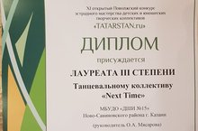 Поздравляем танцевальный коллектив "Next time" и их руководителя Мясарову Ольгу Александровну с успешным выступлением на XI Открытом Поволжском конкурсе эстрадного мастерства детских и юношеских творческих коллективов "TATARSTAN.ru"!