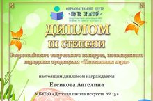 Поздравляем Евсикову Ангелину, учащуюся изобразительного отделения ДШИ №15 с Дипломом 3 степени Всероссийского творческого конкурса, посвященного народным традициям "Пасхальная вера" (руководитель Сутин А.Н.)