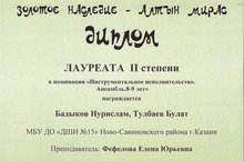 Поздравляем Бадыкова Нурислама, Тулбаева Булата и их преподавателя Фефелову Елену Юрьевну с Дипломом Лауреата 2 степени Республиканского фестиваля детского и юношеского творчества "Золотое наследие - Алтын мирас"!
