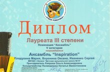 Поздравляем ансамбль преподавателей ДШИ №15 "Inspiration" (Воронина Оксана Анатольевна, Плодухина Мария Анатольевна, Иваненко Сергей Сергеевич, Поликарпова Наталья Валентиновна) с Диполмом Лауреата III степени в Международном конкурсе исполнителей на народных музыкальных инструментах "Кубок Поволжья"!
