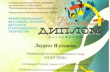 "Уличный танец" - "Next Time", 10-12 лет - Лауреат 2 степени (руководитель Мясарова О.А.)