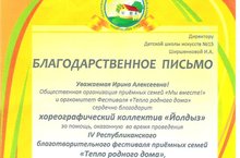 Благодарственное письмо за помощь, оказанную во время проведения IV Республиканского благотворительного фестиваля приемных семей "Тепло родного дома". Выступление хореографического коллектива "Йолдыз" оставило неизгладимое впечатление как у участников-приемных семей, так и у всех гостей Фестиваля.