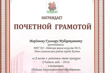 Поздравляем Мараданову Гуьнару Мубаракзяновну, преподавателя ДШИ №15 - призера районного этапа конкурса профессионального мастерства «Лучший учитель года города Казани – 2016» в номинации "Педагог дополнительного образования".