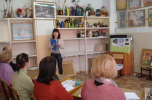 Сагирова Э.А. (высшая квалификационная категория) познакомила преподавателей с проблемой использования инновационных технологиий на уроках ИЗО в форме презентации авторской программы "Мой мир в искусстве" (история искусств) и познакомила с методической разработкой мультимедийного урока по предмету "Декоративная композиция".