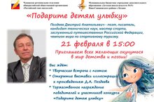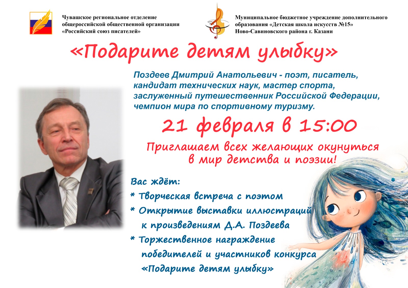 21 февраля в стенах нашей ДШИ состоялась творческая встреча с поэтом Дмитрием Анатольевичем Поздеевым, к которой наши учащиеся очень готовились! Дети подготовили иллюстрации к произведениям поэта. На отделении изобразительного искусства состоялся конкурс-выставка "Подарите детям улыбку", победители и участники были торжественно награждены!