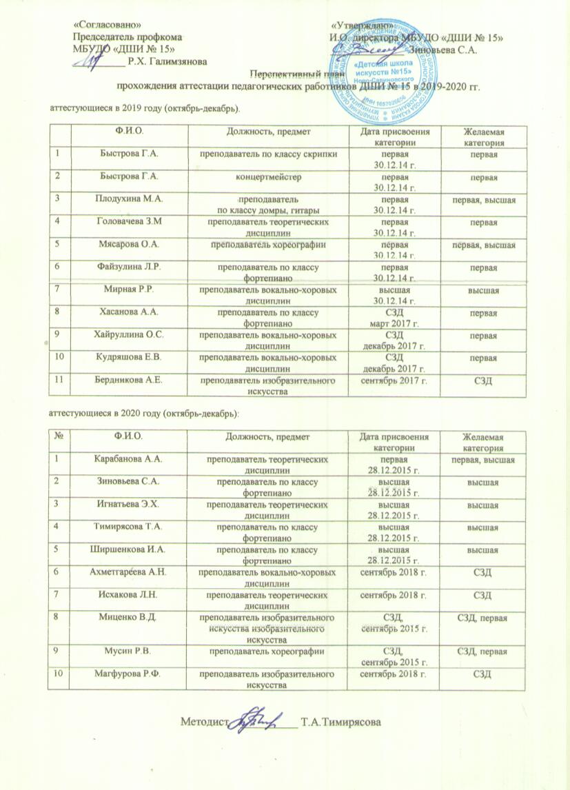 Перспектитвный план проведения аттестации педагогических работников ДШИ №15 на 2019-2020 учебный год