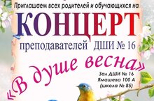 17 апреля в 17.30 приглашаем всех родителей и обучающихся на концерт преподавателей ДШИ №16 "В Душе весна". Концерт будет проходить в зале ДШИ№16.