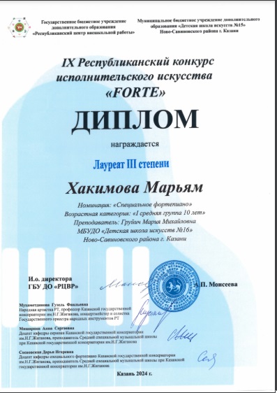 Хакимова Марьям - лауреат 3 степени (преп. Груйич М.М.);
