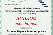 Поздравляем Багаеву Ларису Александровну с дипломом победителя II Всероссийского фестиваля "Ступеньки профессионального мастерства"!