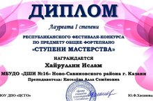 13 апреля 2023 года на Республиканском конкурсе-фестивале по предмету общее фортепиано обучающийся МБУ ДО "ДШИ №16" Хайруллин Ислам стал лауреатом I степени. Поздравляем Ислама и его преподавателя Киселеву Аллу Семеновну, желаем дальнейших творческих успехов!