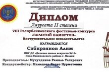 Сабирзянов Алим - лауреат II степени ( преподаватель Мухутдинов Р.Т., концертмейстер Мамедова Б.Н.);