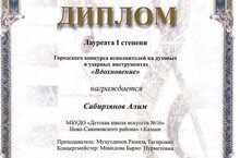19 марта 2023 года в Казани состоялся городской конкурс исполнителей на духовых и ударных инструментах "Вдохновение", на котором Сабирзянов Алим ( преподаватель Мухутдинов Р.Т., концертмейстер Мамедова Б.Н.) получил диплом лауреата I степени! Желаем дальнейших творческих достижений!