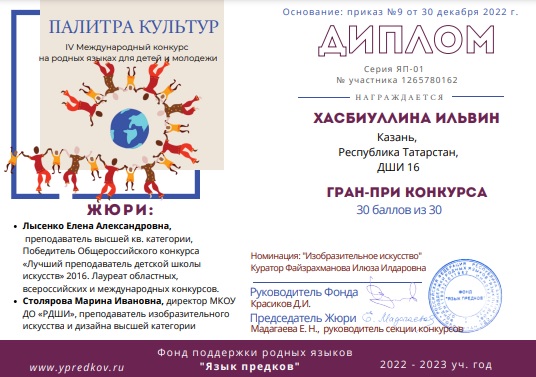 Хасбиуллина Ильвин - обладательница гран-при международного конкурса "Палитра культур"