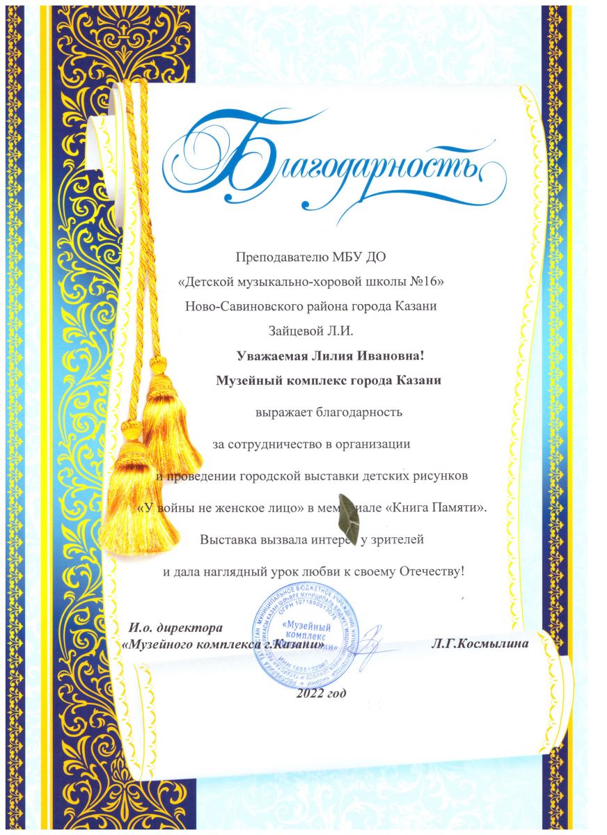 Зайцева Л. И. - Благодарность музейного комплекса г. Казани.jpeg