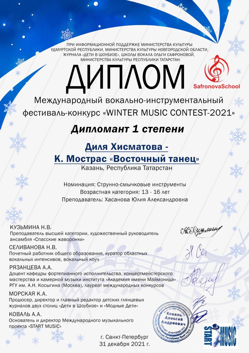 Хисматова Д. - Дипломант I степени конкурса "WINTER MUSIC CONTEST-2021".jpeg