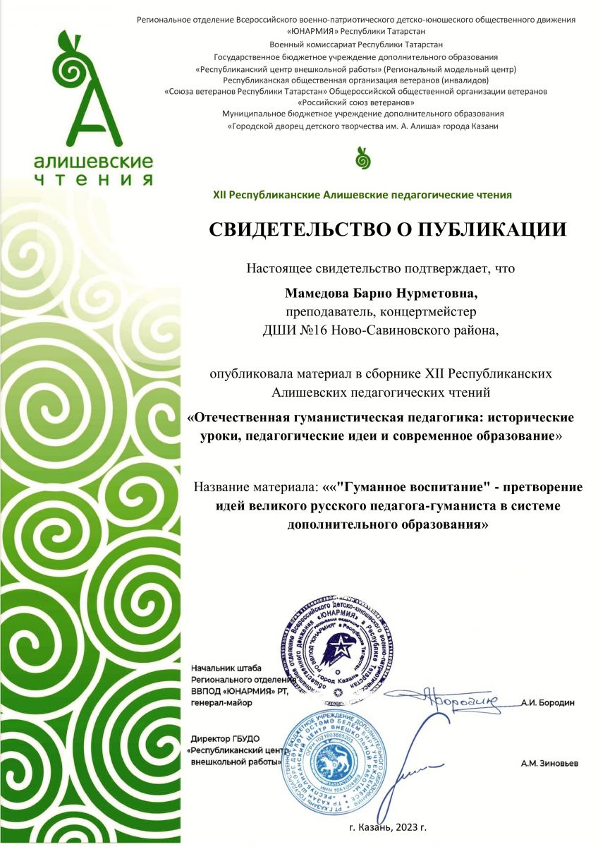 Мамедова Б.Н. - Свидетельство о публикации "Алишевские чтения"
