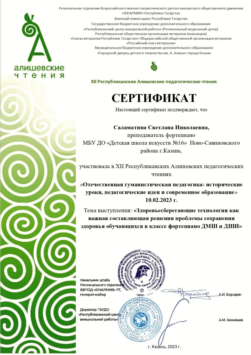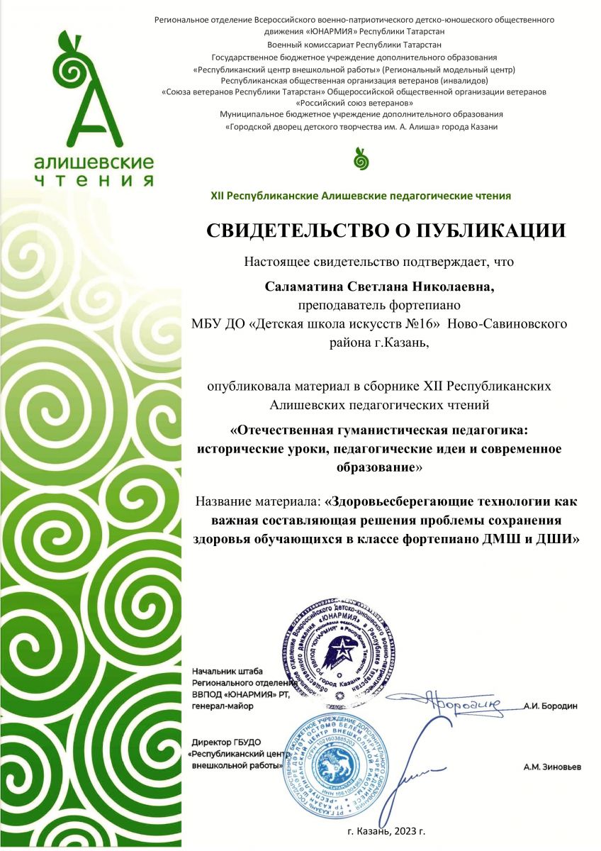 Саламатина С.Н. - свидетельство о публикации "Алишевские педагогические чтения"